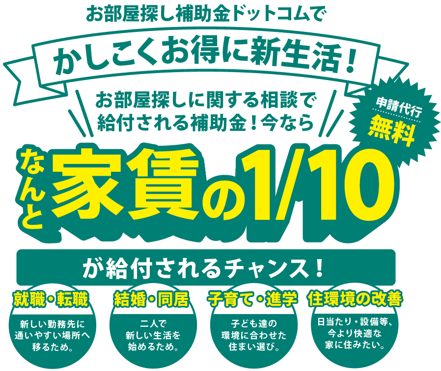 お部屋探しに関する疑問や不安を相談でき、そのうえで家賃の1/10が給付される。安心と実益の両方が手に入る。